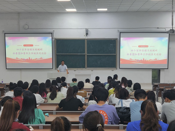 为落实党建带团建制度机制,加强大学生思想政治教育,服务团员青年发展,5月25日晚,财经学院党委书记杜小明应邀为2022年“青马工程”大学生骨干培训班暨第四期团校学员作《深入学习习近平总书记在庆祝中国共产主义青年团成立100周年大会上的讲话精神》主题辅导报告。报告会由学院纪委副书记、团委书记薛枫主持。