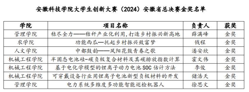 近日,安徽省大学生创新大赛(2024)获奖名单公布,我校共获奖47项,其中参赛项目“功能西瓜—托起乡村振兴致富梦”“中都鼓韵——凤阳花鼓青春之歌”“电力系统多维度多功能智能巡检机器人”等7个项目获省赛金奖,“节尽所能——智控节能搭快车助力全球节能发展”等17个项目获省赛银奖,“创维新视界”——基于新型氧化钨智能变色引领者”等23个项目获省赛铜奖。省赛金奖数量及获奖总数在省内地方应用型高校中排在前列,学校获优秀组织奖,郑谦、吴燕、张聪、查文珂、但文蛟、董福龙6位老师获优秀创新创业导师奖。