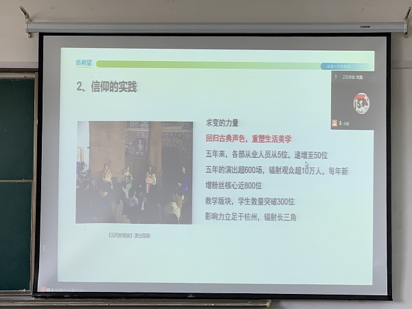 会上,陈小敏讲述了自己身边的三个创业案例。徐小柠,毕业于浙江大学农学系,绘甜农业创始人,火龙果产业研究专家。她从一颗优质的燕窝果开始,撬动百亿高端市场。她说:“种地人实际上是和土壤做交换的生意人。”施剑,中国人民大学历史学博士,雅部院创始人,杭州南宋文化研究院副院长,世界遗产保护杭州研究中心研究员。他说:“因为博大,得其精深。做人治学、创业都是这样。年轻或许在很多人眼里代表着幼稚,但在我的心中,年轻只有一种象征义,就叫做生机。”王暾,中国科学院力学研究所博士,美国康涅狄格大学并取得物理学博士学位,奥地利科学院从事博士后,从事地震预警系统研发人,他认为创业过程中,要创造孤独,承受孤独,享受孤独。三个不同的案例分别从兴趣的发酵、信仰的实践和家国情怀三个角度介绍了创业的初衷,更让同学们懂得每一个华丽的转身,背后都是不为人知的辛酸,外表的光鲜亮丽,背后都是辛勤汗水与辛劳付出,一分耕耘,一分收获。