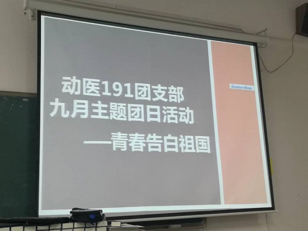 动物医学183团支部在求知楼A404展开了以“爱国,你我共参与”为主题的活动,通过唱团歌、观看视频的形式为祖国献上祝福,团支书孙娜通过分享自己身边的爱国主义先进事例,用身边榜样的真人真事、真情实感来激发同学们对爱国情怀,引起青年学生们的情感共鸣和价值认同。