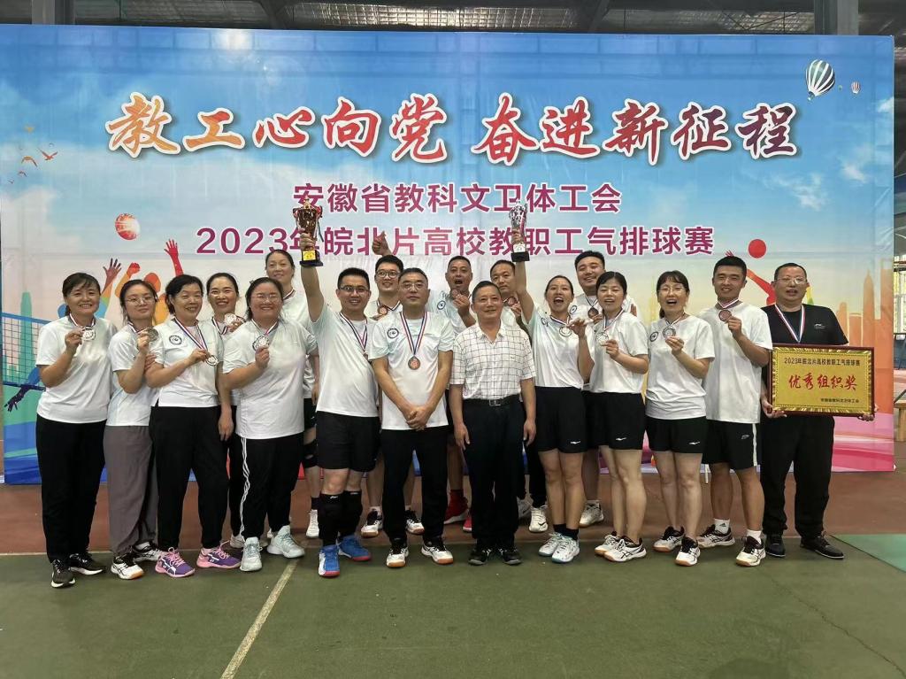 由安徽省教科文卫体工会主办,淮南师范学院承办的2023年皖北片高校教职工气排球赛,9月24日胜利闭幕。本次气排球赛分男子组和女子组,共有皖北片10所高校,共计20支代表队参赛。经过二天的激烈、精彩的比赛,我校教职工女子代表队斩获亚军,我校教职工男子代表队荣获季军,我校是唯一女子和男子代表均获奖的参赛高校。