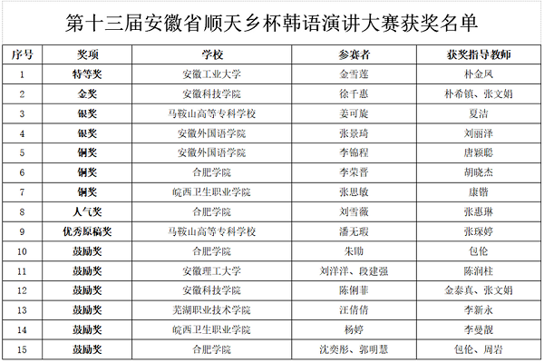 为深入学习习近平新时代中国特色社会主义思想和党的十九大精神,全面贯彻落实全国教育大会和新时代教育对外开放工作会议精神和要求,进一步提升我省高校大学生的韩语交流水平,由安徽省教育厅组织,合肥学院和韩国顺天乡大学共同举办的“第十三届安徽省‘顺天乡’杯韩国语演讲大赛”于2020年12月落下帷幕。