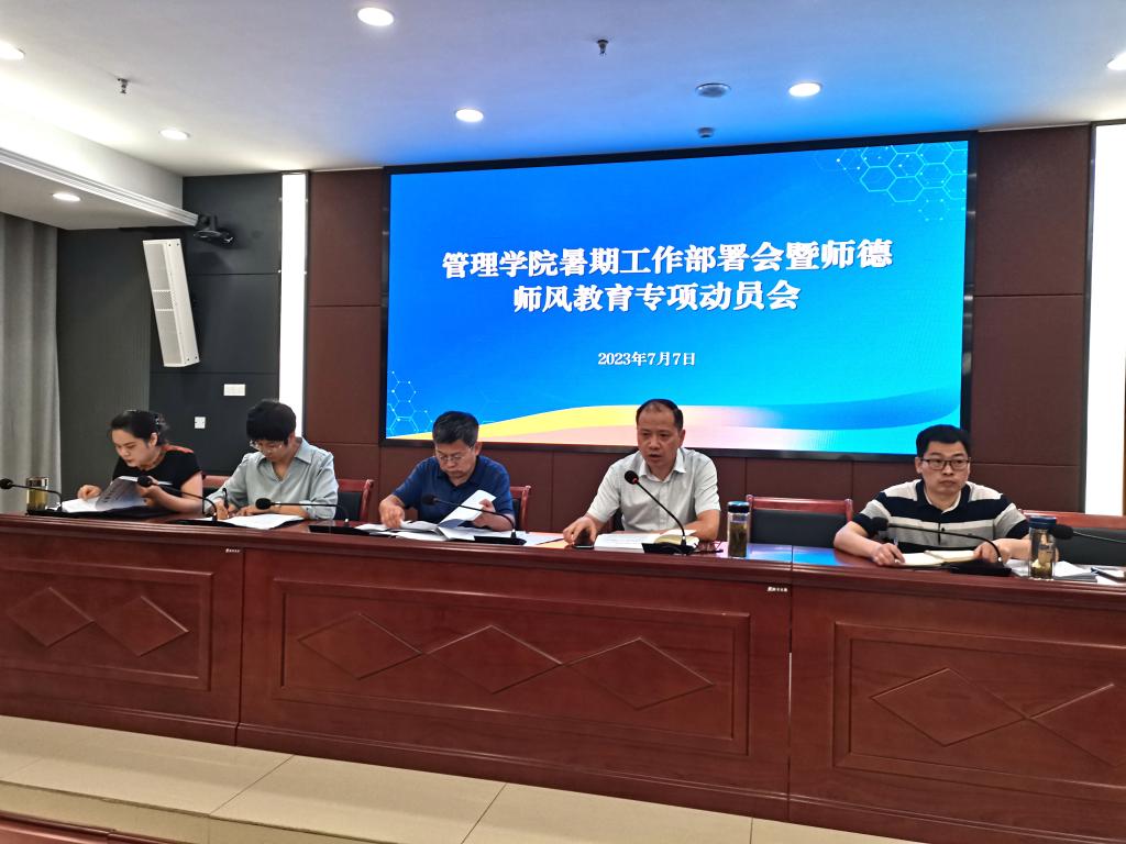 为切实推进暑期各项重点工作有效落实,强化学院教师队伍师德师风建设,7月7日上午,管理学院在西附楼111会议室召开暑期工作部署会暨师德师风教育专项动员会。学院党政领导及全体教职工参加会议,会议由学院党委书记丁景良主持。