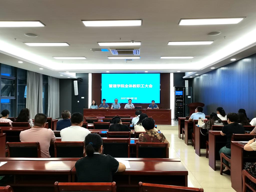 9月1日下午,管理学院在龙湖校区西附楼111会议室召开全体教职工大会,学院党政领导及全体教职工参加了会议。会议由学院党委书记丁景良主持。