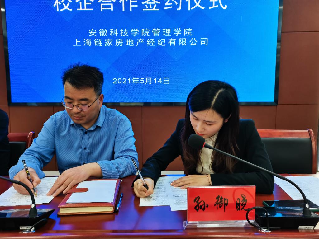 赵伟峰与孙御晓共同签署了《新半岛官方网站_半岛(中国)与上海链家房地产经纪有限公司校企合作协议书》。