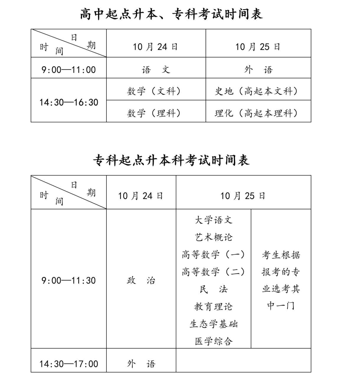 全国成人高考统一考试时间参见下表(如有变化,按教育部最新文件精神执行):
