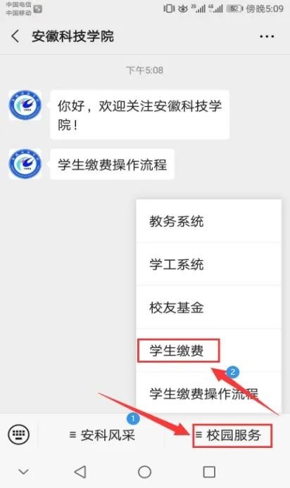 1.点击“新半岛官方网站_半岛(中国)微信公众号”界面右下角“学生缴费”菜单。