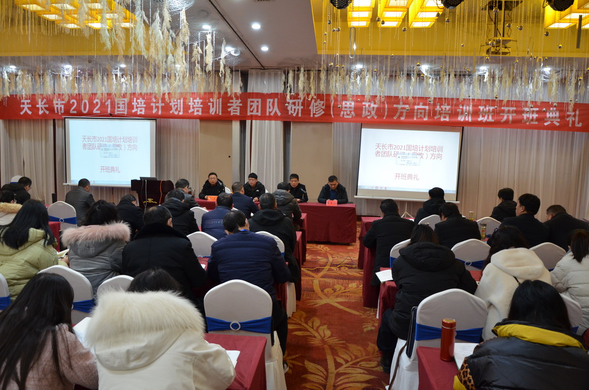 为推动天长市思想政治理论课教师及分管领导的培育工作,学习了解近年来思政教育领域最新成果和发展动态,全面提升参训者思政能力和水平,根据《关于开展天长市2021国培计划培训者团队研修(思政)方向培训班的通知》(天教体函〔2021〕194号)文件精神,1月15日上午8点,在凤阳帝城酒店举行了天长市2021国培计划培训者团队研修(思政)方向培训班的开班典礼,天长市教育体育局副局长周家华,天长市教育体育局人事师资股副股长姜明,天长市教师进修学校党委委员、培训部主任王长山,我校继续教育学院院长杨维来及本班全体学员等参加了开班典礼,典礼由王长山主持。