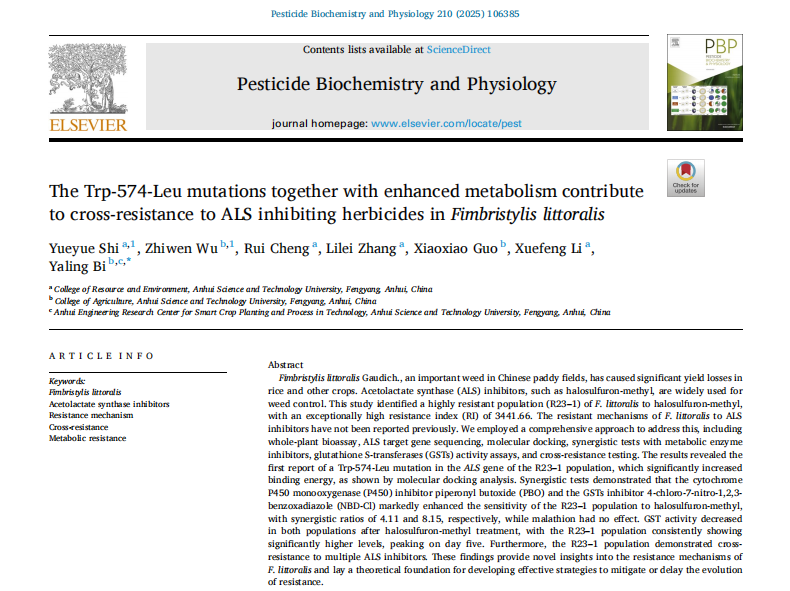 近日,我校农学院毕亚玲教授团队在国际知名期刊《Pesticide Biochemistry and Physiology》(中科院一区Top期刊,IF=4.2)发表了题为“The Trp-574-Leu mutations together with enhanced metabolism contribute to cross-resistance to ALS inhibiting herbicides inFimbristylis littoralis”的研究论文。该研究首次揭示了稻田恶性杂草水虱草(Fimbristylis littoralis Gaudich.)对乙酰乳酸合成酶(ALS)抑制剂类除草剂的抗性机制。硕士研究生史悦悦和青年教师吴志文博士为共同第一作者,毕亚玲教授为通讯作者,新半岛官方网站_半岛(中国)为唯一完成单位。
