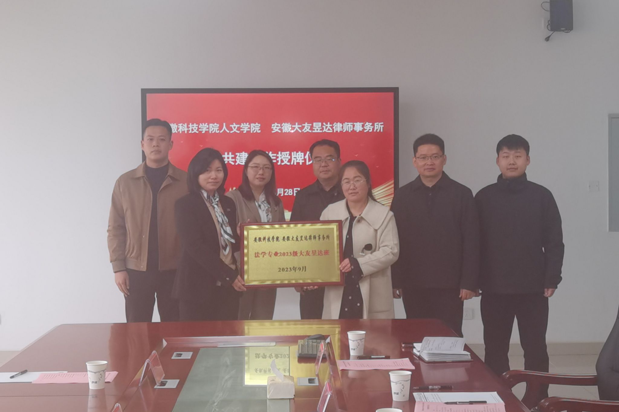 3月28日下午,人文学院与安徽大友昱达律师事务所,在人文学院313会议室,举行共建合作授牌仪式。安徽大友昱达律师事务所主任王苏敏、合伙人安鹃、律师杨祉龙;人文学院党委副书记、院长李晓东,副院长牛永辉、党委副书记李沙娜、法学系教授骆绪刚、辅导员徐琦琦出席。仪式由牛永辉主持。