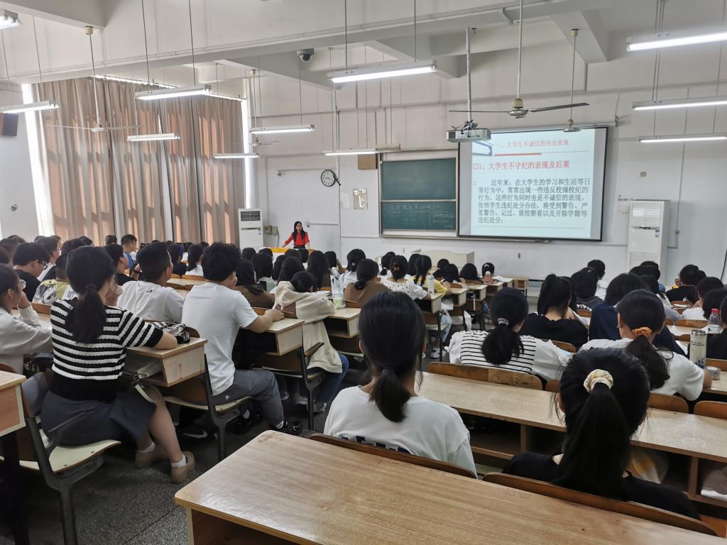鲁冰冰讲述了诚信的含义与重要性,列举了少数大学生不守纪、不守法、不守信的突出表现及严重后果。她指出,大学生在生活方面应当遵规守纪、自尊自爱;在学习方面应当遵守课堂秩序,创建良好学风;在学术、资助、求职就业方面应该诚实守信。她带领全体新生学习了《新半岛官方网站_半岛(中国)学生日常行为规范》,讲述了大学生校园礼仪的重要性,在宿舍群体生活礼仪、校园课堂礼仪、师生交往礼仪、参加校园集体活动礼仪等方面提出了具体要求,认真回答了同学们就学习生活方面提出的具体问题,帮助新生更好的完成“大学生”身份的转变。