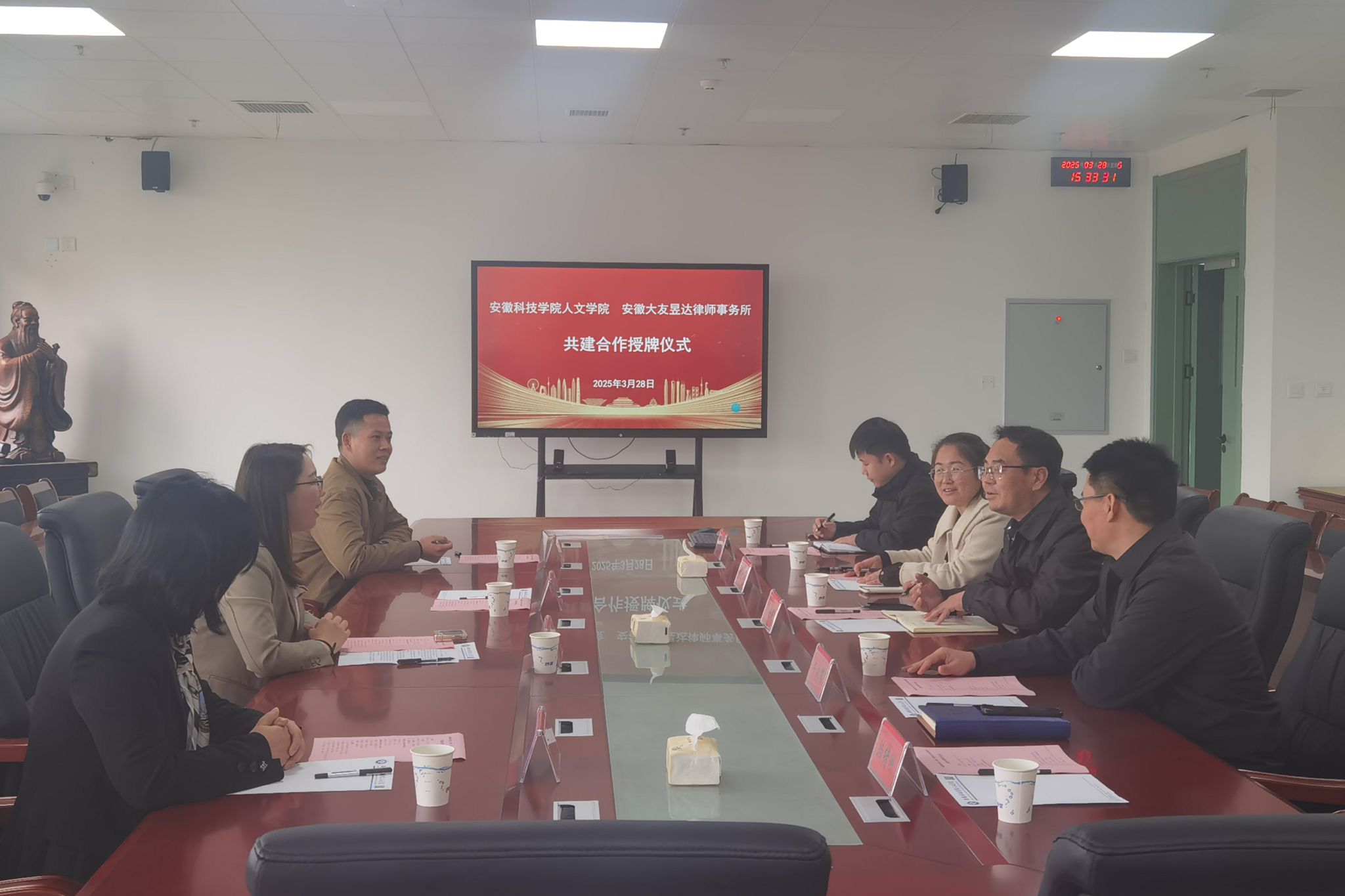 3月28日下午,人文学院与安徽大友昱达律师事务所,在人文学院313会议室,举行共建合作授牌仪式。安徽大友昱达律师事务所主任王苏敏、合伙人安鹃、律师杨祉龙;人文学院党委副书记、院长李晓东,副院长牛永辉、党委副书记李沙娜、法学系教授骆绪刚、辅导员徐琦琦出席。仪式由牛永辉主持。