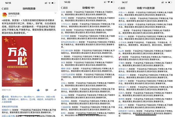 我宣誓“不造谣传谣,不提前返校,不聚集扎堆,不随意外出。要提高警觉,要加强防范,要及时报告,要健康宅家”。在疫情防控工作到了最吃劲的关键阶段,动物科学学院广大团员青年的思想上和行动上始终没有丝毫放松,全院一千余名学生共同线上签订“防疫承诺”,筑起严密牢固的防疫战线。