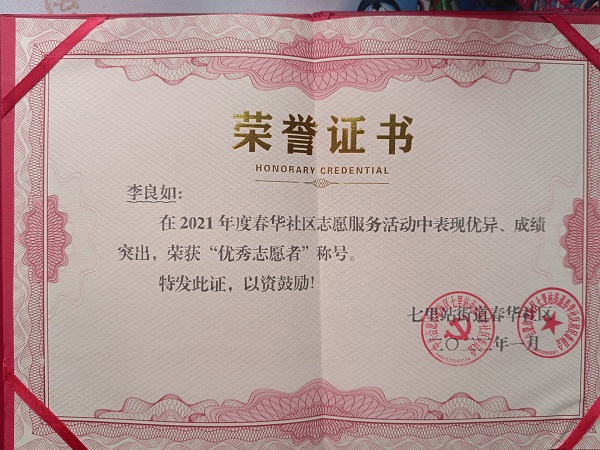 志愿者们在队长李良如带领下深入辖区各小区门岗,联合物业人员在小区进出口设置“外来人员和车辆劝返点”,发放宣传资料及测量体温,并详细记录人员和车辆信息,对体温异常者,进行跟踪排查,叮嘱外出居民一定要戴好口罩,加强自我防护,注意自身安全。由于出色的工作,她获得了社区“优秀志愿者”称号。