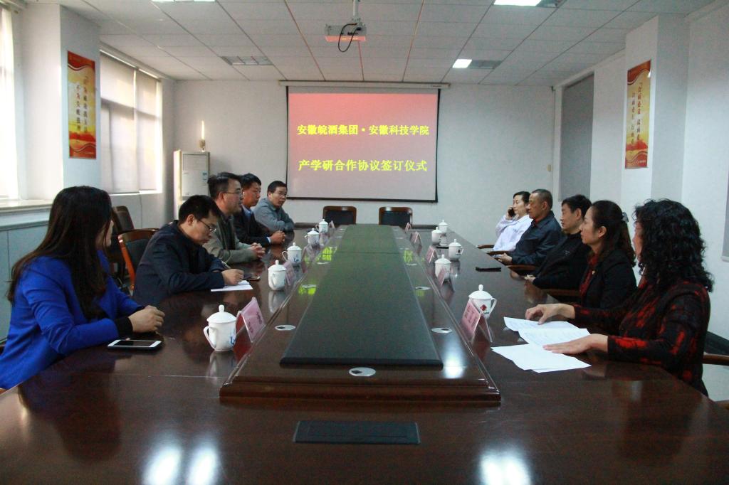 赵伟峰等在陈翔总经理的陪同下,首先参观了皖酒集团的企业博物馆和产品生产线,了解皖酒的制作酿造工艺流程,并深入探讨了在企业发展中存在的主要问题。随后,赵伟峰与皖酒集团总经理陈翔签署了产学研合作协议,并就双方未来在师资培养、学生实习、企业培训、项目合作等具体合作事项展开讨论和设计。