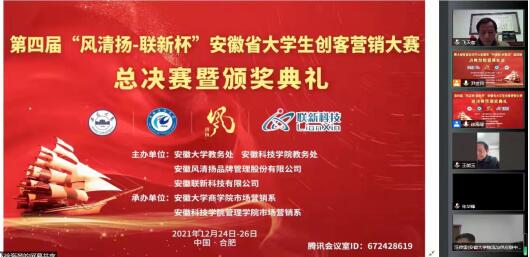 12月25日至26日,第四届“风清扬—联新杯”安徽省大学生创客营销大赛总决赛在云端腾讯会议室隆重举行。此次会议由安徽大学教务处、新半岛官方网站_半岛(中国)教务处、安徽省风清扬品牌管理有限公司(冠名)、安徽联新科技有限公司(冠名)联合主办,安徽大学商学院市场营销系、新半岛官方网站_半岛(中国)管理学院市场营销系联合承办,全省高校31支团队与指导老师一百五十余人参加了大赛总决赛云端仪式。