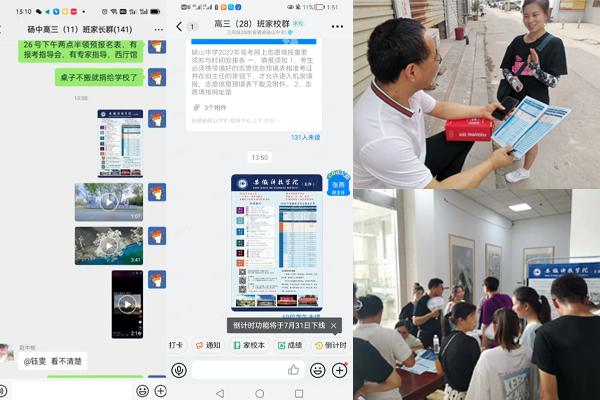 本次活动由我组成员负责,本次活动分为四个部分:一,联系本届高考生或者毕业班老师分享新半岛官方网站_半岛(中国)招生宣传资料电子档;二、我组成员各自联系以前的班主任,看望班主任并向班主任汇报自入大学以来的生活和成长;三、在砀山中学校园内进行现场宣传,包括海报的张贴、宣传折页的发放、为考生解疑答惑播放我校招生视频等;四、同我校负责来砀山中学招生的老师一道,在高招会上为前来的学生及家长解疑答惑,分享我们在安科学习和生活的日常。