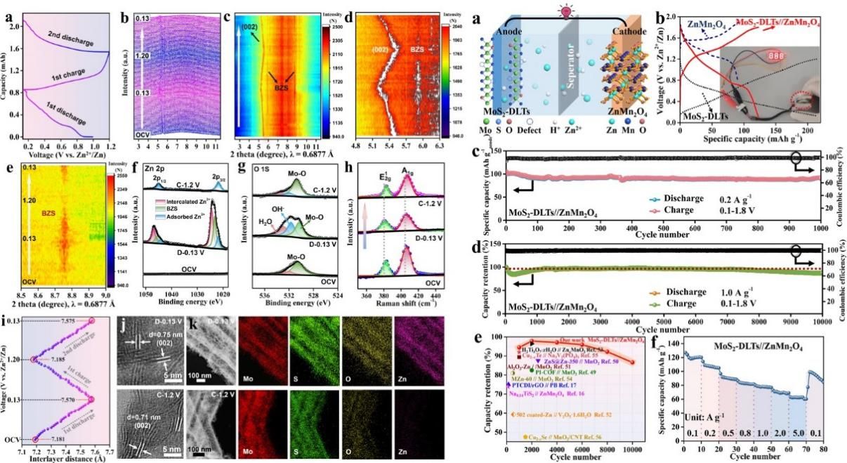 水系锌离子电池因其低成本和高安全性而受到广泛关注,但锌金属负极的枝晶生长、低镀/剥效率、表面钝化和自腐蚀等问题阻碍了其应用。本文提出了一种一步原位分子工程策略,用于同时构建具有扩大的层间距、氧掺杂、结构缺陷和丰富的1T相的分级MoS2双层纳米管(MoS2-DLTs),显示出优异的循环寿命,组装的MoS2-DLTs//ZnMn2O4全电池表现出令人印象深刻的循环稳定性,优于大多数报道的“摇椅式”AZIBs。本工作还通过同步辐射原位粉末X射线衍射和多重离位表征技术研究了MoS2-DLTs的Zn2+/H+共插层储能机理,成功证实了二硫化钼作为插层式锌存储负极的可行性,对二维材料的设计和水系全电池的构建具有重要的借鉴和指导意义。(特约通讯员:薛璐莎 审核:张炎)