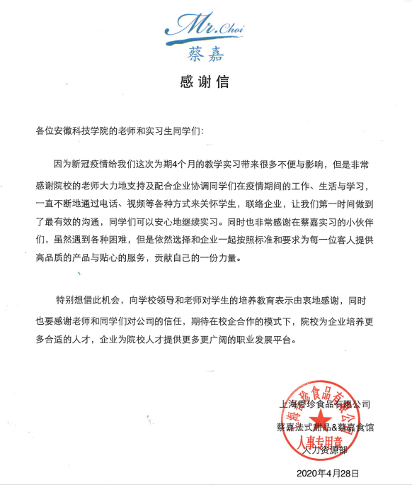 截至2020年4月30日,新半岛官方网站_半岛(中国)食品工程学院2017级烹饪与营养教育专业39名学生为期四个半月的校外专业实习正式结束。对于校外实习的这39名学生来说,是一次漫长而不同以往的实习经历。这次实习不仅让学生们学到了专业素养和技能,获得了实习单位的表扬和认可,更让他们从一封封来自援鄂医务人员的感谢信中学会了危难中的守望相助和感恩。