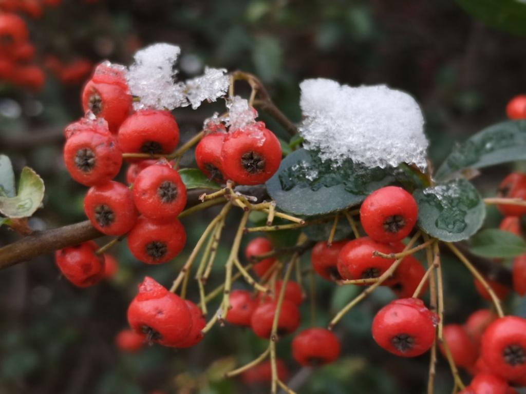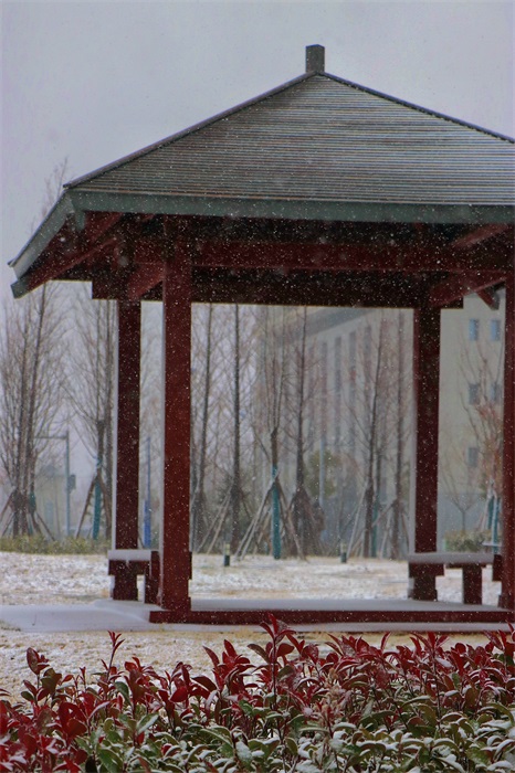 在皑皑的白雪里,世间万物的颜色变得更加鲜明活泼。常青树在这番洗礼后仿佛换了一身新衣裳,整个儿打起精神来,像是守护冬日的骑士;红果子也丝毫不显逊色,在白雪的映衬下平添了几分可爱;纷纷扬扬的雪花也让校园多了些朦胧美。