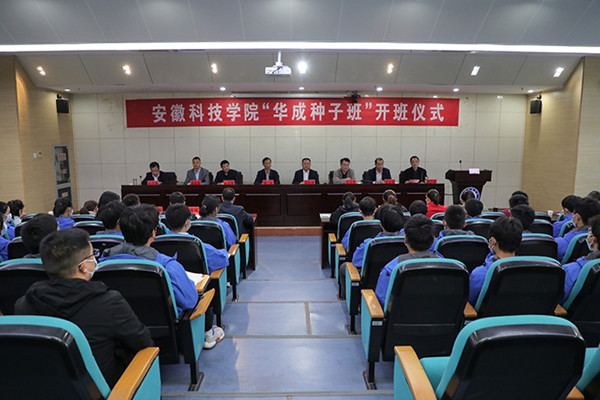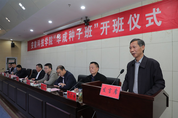 10月19日下午,我校农学院在凤阳校区会议中心一楼报告厅举行“华成种子班”开班仪式。校党委副书记、院长李震应邀出席并发表讲话。校教务处处长、创新创业学院院长赵伟峰,党委学工部部长、学生处处长黄立义,招生与就业工作处副处长何晓冬;安徽华成种业股份有限公司董事长刘良柏,总经理王平信,董事会秘书、人力资源部部长王晶晶,党政办主任、宣传部部长韩欢;农学院党政领导、教师代表、辅导员代表、“华成种子班”行政班主任、专业班主任和全体学生参加仪式。开班式由农学院党委副书记、院长崔广荣主持。