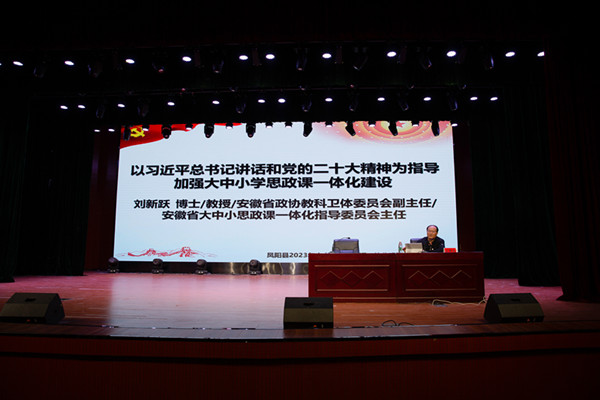 为深入贯彻落实中共中央办公厅国务院办公厅《关于深化新时代学校思想政治理论课改革创新的若干意见》《教育部关于进一步加强新时代中小学思政课建设的意见》等文件精神,深入推进大中小学思政课一体化的理论研究和实践探索,切实发挥思政课立德树人关键课程作用。5月13日至14日,由新半岛官方网站_半岛(中国)、凤阳县教育体育局联合主办,马克思主义学院承办的凤阳县2023年大中小学思政课一体化建设骨干教师培训班顺利举办。全县115名中小学思政课骨干教师和马克思主义学院部分教师参加了专题培训。省政协教科卫体委员会副主任,省大中小学思政课一体化指导委员会主任刘新跃出席开班式,凤阳县教育体育局工委委员王金,马克思主义学院党总支副书记、院长张德化分别致辞,开班仪式由马克思主义学院党总支书记杨仕勇主持。