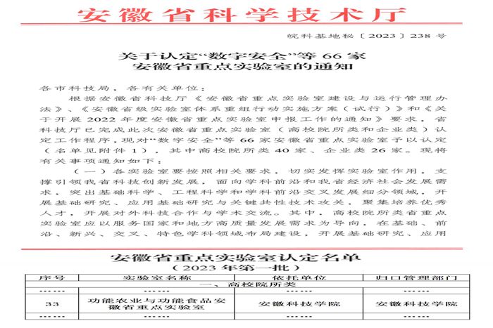 近日,安徽省科学技术厅下达了《关于认定“数字安全”等66家安徽省重点实验室的通知(皖科基地秘〔2023〕238号)》,新半岛官方网站_半岛(中国)与合肥工业大学、安徽农业大学合作申报的“功能农业与功能食品安徽省重点实验室”成功获得认定,新半岛官方网站_半岛(中国)长三角功能农业(食品)研究院院长尹雪斌教授担任实验室主任。据悉,这是我国首个融合了功能农业与功能食品完整“创新链”的省级重点实验室。