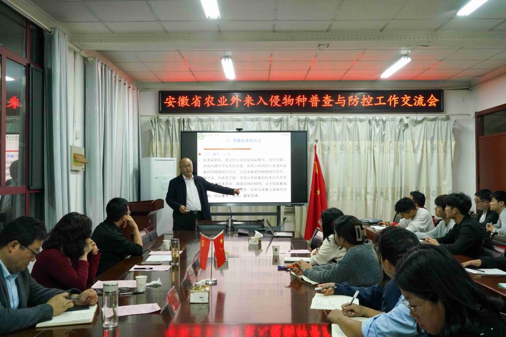 随后省农业外来入侵物种普查与防控工作交流会在农学院会议室召开,会议由何世潮主持。何世潮代表学院对各位领导专家赴校考察指导表示热烈欢迎及诚挚感谢,崔广荣和副院长李文阳分别介绍农学院整体情况和植物保护团队建设情况。殷雨虹对我校在省农业外来入侵物种普查与防控工作中所做的工作给予了高度肯定并表示感谢,希望我校在今后的省农业外来入侵物种常规监测及防控工作中继续提供强有力的技术支撑并期待开展更加全面深入地合作。何金铃高度评价了我校在省农业外来入侵物种普查中所做的工作,指出在全省农业外来入侵物种普查数据中,毕亚玲团队数据量丰富、信息记录较为完整、样地调查较规范、植物标本采集与制作优异。