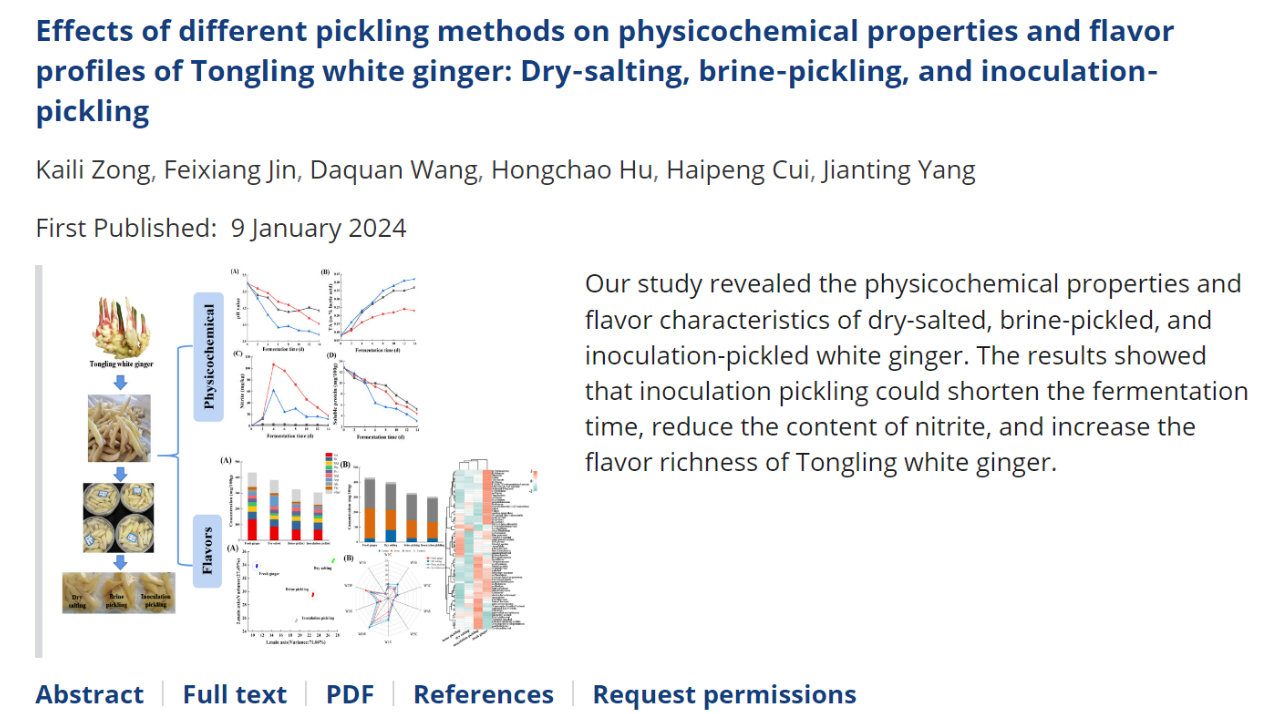 1月9日,我校果蔬精深加工与营养控制创新团队在农林科学领域二区期刊Food Science & Nutrition(IF=3.90)在线发表题为“Effects of different pickling methods on physicochemical properties and flavor profiles of Tongling white ginger: Dry‐salting, brine‐pickling, and inoculation‐pickling”的研究论文。我校食品工程学院2021级食品加工与安全领域研究生纵凯莉为第一作者,杨剑婷副教授为通讯作者,新半岛官方网站_半岛(中国)为唯一完成单位。