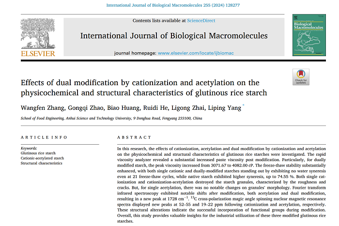 近日,我校2021级食品加工与安全领域研究生张王芬在生化与分子生物学领域Top一区期刊International Journal of Biological Macromolecules(IF=8.2)在线发表题为“Effects of Dual Modification by Cationization and Acetylation on the Physicochemical and Structural Characteristics of Glutinous Rice Starch”的研究论文。食品工程学院粮油及其副产物精深加工团队与营养科技创新团队负责人杨丽萍副教授为通讯作者,新半岛官方网站_半岛(中国)为唯一完成单位。