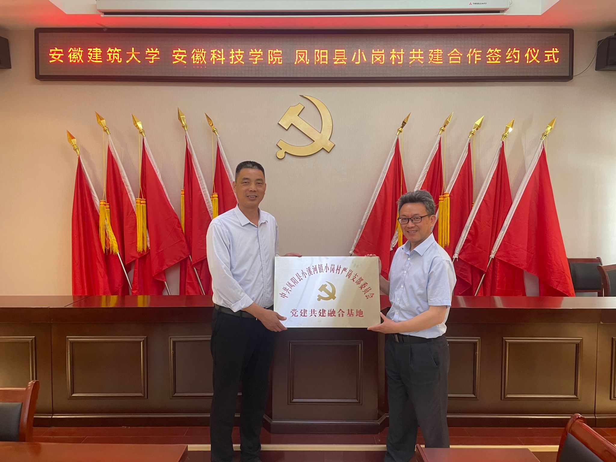 根据新半岛官方网站_半岛(中国)《关于进一步深化与凤阳县小岗村战略合作助力乡村振兴实施方案》和《2024年深化与凤阳县小岗村合作推动乡村治理重点工作安排》,为充分发挥人文学院党委“全省高校党建工作标杆院系”和全省高校“双带头人”教师党支部书记工作室的引领辐射作用,深化校地全面合作,助力小岗村基层党建提质增效与融合发展,在学校与凤阳县小岗村战略合作领导小组办公室(以下简称“校小岗合作办”)和党委组织部、宣传部的牵头协调和精心组织下,5月15日下午,人文学院党委携手安徽建筑大学公共管理学院党委,与小岗村严岗党支部联合开展结对共建,在小岗村党员活动室举行党建共建合作签约暨党建共建融合基地揭牌仪式。我校党委委员、校小岗合作办常务副主任、机关党委书记卫胜主持仪式,党的二十大代表、小岗村党委书记、村委会主任周群之,人文学院党委副书记、院长李晓东,安徽建筑大学公共管理学院党委委员、副院长连瑞瑞出席仪式并讲话。