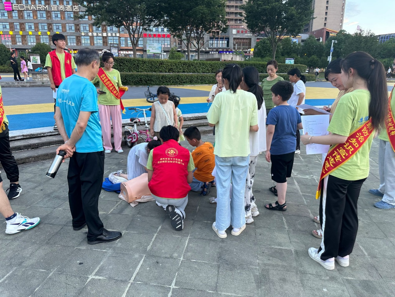 团队成员结合自身专业知识并通过发放精心制作的健康宣传资料,宣传资料涵盖了各种健康主题,包括日常保健常识、常见疾病的预防和应对方法、合理用药知识、营养饮食指南等,居民们可以在闲暇时间翻阅这些资料,进一步巩固和加深对健康知识的理解。为进一步提升群众面对突发事件、意外伤害的应急意识和自救互救能力,普及应急救援知识,团队成员在桂花广场进行心肺复苏和海姆立克等急救技能实践操作宣传。持有“红十字救护员证”的老师和志愿者为大家详细讲解了心肺复苏等急救技能的重要性和操作要点。通过现场演示,向居民耐心地讲解每个步骤的要领,“首先,要判断患者是否有意识和呼吸,然后迅速呼叫救援……”居民们围拢在周围,聚精会神地聆听。团队成员示范结束后,居民们纷纷踊跃尝试,在团队成员的指导下居民们从一开始的生疏到逐渐熟练,他们脸上洋溢着收获知识的喜悦。一位参与体验的居民表示:“以前总觉得这些急救技能离我们很远,今天亲身体验后才发现其实只要掌握了方法,我们也能在关键时刻救人一命。”活动现场气氛热烈,大家纷纷表示受益匪浅,希望今后更多这样的实践活动能够走进社区。
