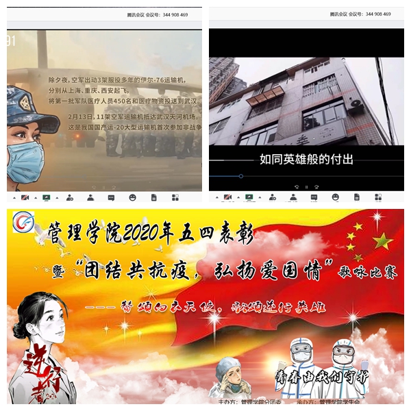 为表彰团内先进,引领全院团员青年争优创先,弘扬五四精神,激发爱国热情,积极践行社会主义核心价值观,5月13日晚,管理学院通过腾讯会议APP举办了2020年团内表彰大会暨“团结共抗疫,弘扬爱国情”歌咏比赛。管理学院全体辅导员老师及受表彰班级和个人、学生党员、入党积极分子和非毕业班团支委成员参加了活动。