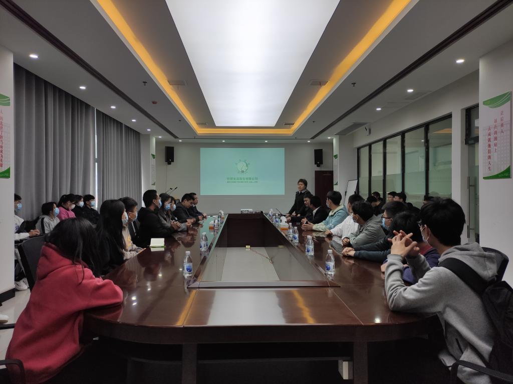 何世潮一行受到了公司环保后勤负责人吴亮经理的热情接待,吴亮亲自担任讲解员,全程陪同。进入公司后,吴亮带领大家分别参观了公司的展厅、监控台和养殖厂区。在会议室召开的交流座谈会上,省级财务负责人苏晶晶结合公司发展历程和现状,播放了企业宣传片,和同学们介绍了公司的发展规划、企业文化和人才需求等,公司生产总监李冰辉陪同座谈。