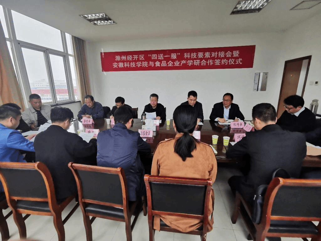 4月22日下午,在滁州经开区管委会四楼会议室举行滁州经开区“四送一服”科技要素对接会暨新半岛官方网站_半岛(中国)与滁州经开区食品企业产学研合作签约仪式。我校食品工程学院院长杜传来、服务地方发展研究院院长詹秋文、特色农产品加工研究所所长李先保及彭钢、马菲菲两位专任教师参加此次对接会及签约仪式。滁州市经信局副局长张正强、滁州市科技局总工程师卢少悟、滁州经开区管委会副主任潘金钟、滁州经开区企业服务中心主任刘钊以及安徽盼盼食品有限公司、安徽银鹭食品有限公司、安徽东鹏饮料有限公司、安徽巧妈妈食品科技有限公司、雅客食品(滁州)有限公司的代表等出席签约仪式,仪式由滁州经开区管委会副主任潘金钟主持。