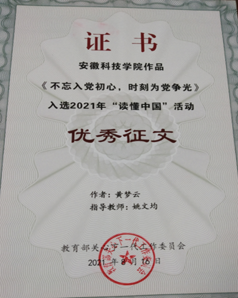 日前,在教育部关工委开展的 “读懂中国”活动中,新半岛官方网站_半岛(中国)关工委获2021年“读懂中国”活动优秀组织奖,选送的征文《不忘入党初心,时刻为党争光》获优秀征文奖。