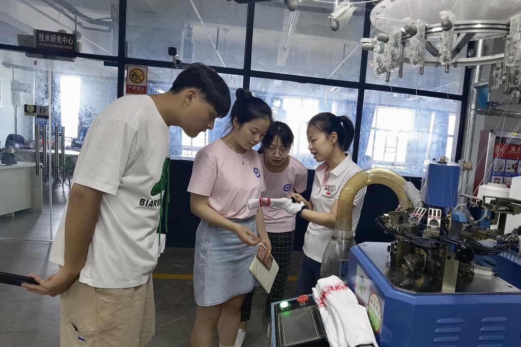 安徽尧舜智能袜业公司是集研发、生产、销售、科研于一体的专业针织袜类集团雏形,2020年被评为全国脱贫攻坚先进集体,袜产业已成为尧渡袜业特色小镇的特色产业。在公司工作人员的带领下,团队成员们参观了生产车间。织造车间内一台台智能织袜机“嚓嚓嚓”运转,每隔一两分钟便诞生一只袜子雏形;工人坐在缝头机前,动作娴熟地快速缝制;冒着热腾腾水蒸气的定型机正对一双双袜子消毒定型……从织造到缝头,从定型到包装,经过一道道严格质检后,一双双袜子漂洋过海,走向世界。