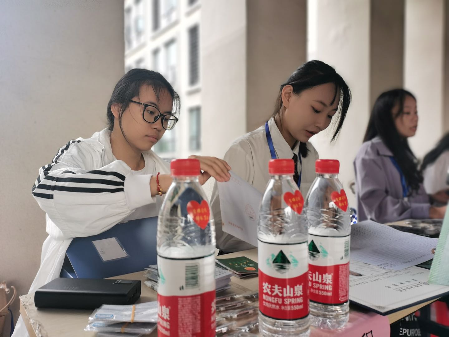 身着蓝色志愿者服装的学长学姐们接过新生手中的行李,背着大包小包带着新同学前往入学信息核验点。