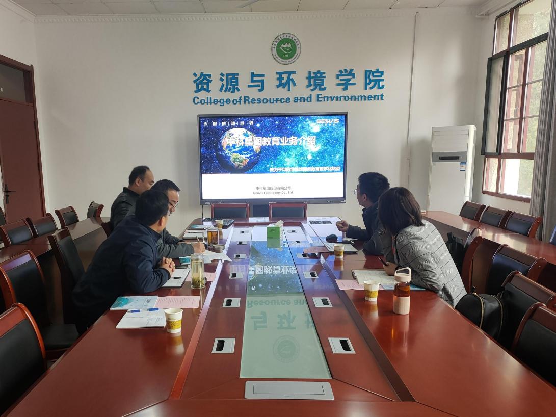 资源与环境学院热烈欢迎中科星图各位领导的到来,李孝良向闫总一行介绍了学院的发展历史和学科专业等建设特色,重点介绍了地理信息科学系产学研现状,分析了地信系产学研合作经验与校企融合机制。沈树周欢详细介绍了学院在学生实习、就业、考研等方面的相关情况。邹海明介绍了学院教学情况,提出了在软硬件协作、青年教师锻炼、企业授课和人才培养等合作建议。鲁立江针对星图地球调研方向介绍了地信系课程建设、实验室共建、产学研合作等情况。