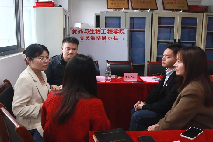 为深入学习习近平总书记给中国农业大学科技小院的同学们回信精神,引导广大青年学子挺膺担当,拓宽院际合作,在五四青年节到来之际,我校食品工程学院党委和蚌埠学院食品与生物工程学院党委联合开展了以“乡村振兴,青年担当”为主题的五四青年节党建带团建主题团日活动。蚌埠学院党委副书记韦文联携食品与生物工程学院党委书记王永斌、院长张斌等亲切会见了我校食品工程学院党委书记付光玺一行。