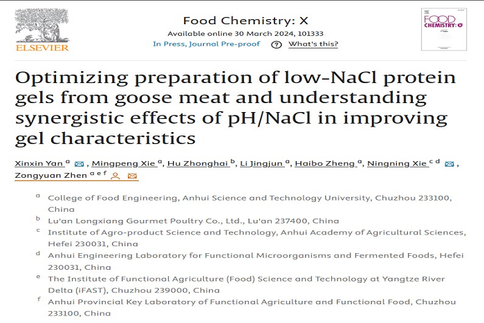 近期,我校食品工程学院动物源食品精深加工与营养团队在中国科学院农林科学领域一区期刊Food Chemistry: X(IF=6.10)在线发表题为“Optimizing preparation of low-NaCl protein gels from goose meat and understanding synergistic effects of pH/NaCl in improving gel characteristics”的研究论文。食品工程学院2021级食品加工与安全领域硕士研究生燕鑫鑫为第一作者,甄宗圆副教授为通讯作者,新半岛官方网站_半岛(中国)为第一完成单位。
