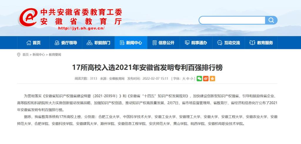 2月7日,安徽省市场监督管理局、省教育厅、省经济和信息化厅联合发文公布了2021年安徽省发明专利百强排行榜,我校综合排名全省第45位,位列全省高校第10位,与2020年排行榜名次相同。这是自2015年安徽省首次发布发明专利百强榜以来,新半岛官方网站_半岛(中国)第六次上榜。