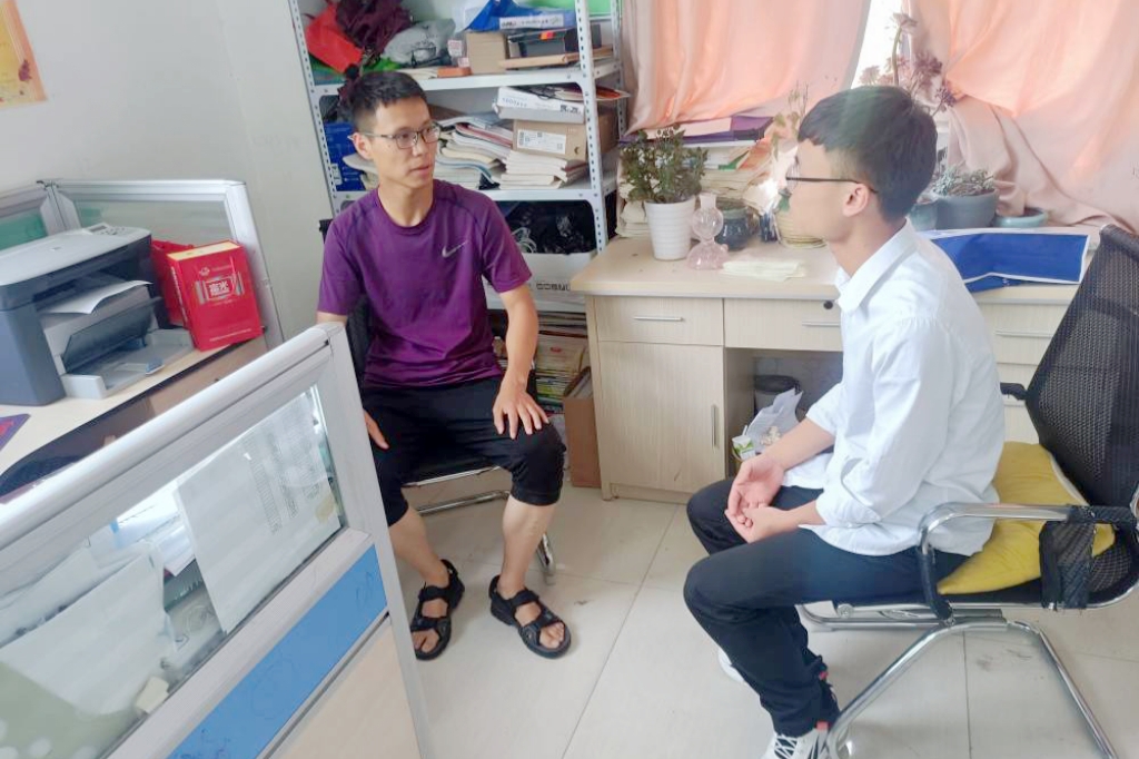 到达校园后,王健伟团队拜访了高三班主任崔猛老师和高中生物老师王乐潇。王健伟向老师说明了此次实践的主要目的和内容,介绍了新半岛官方网站_半岛(中国)的相关情况。在了解团队此行目的之后,崔老师、王老师非常热情地组织了部分高三返校生开展学习交流。