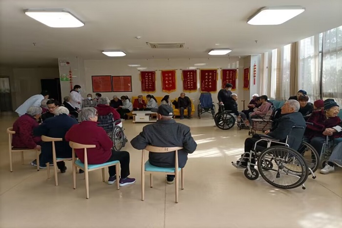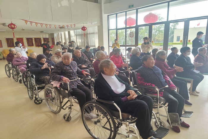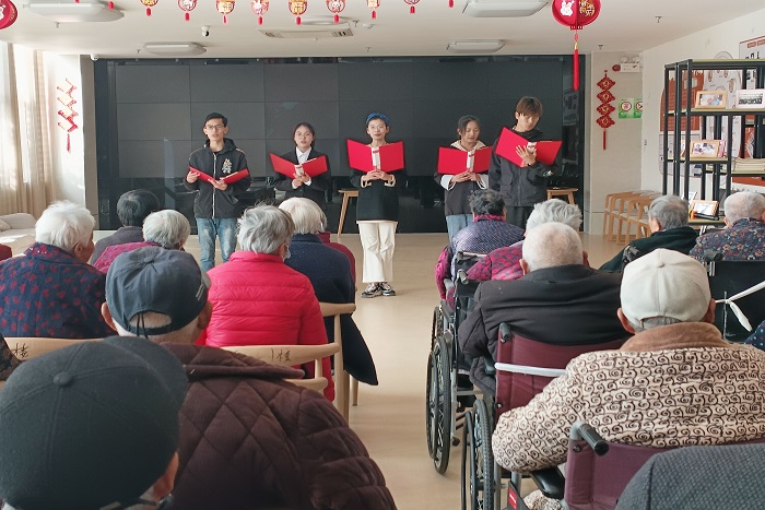 志愿者为老人们带来了朗诵《少年中国说》和歌曲《荷塘月色》,老人们高兴地观看着节目,掌声久久不停,不时还听到老人低语“这个歌好听,这个歌好听”,养老院里充满了欢快、祥和、温暖的气氛。
