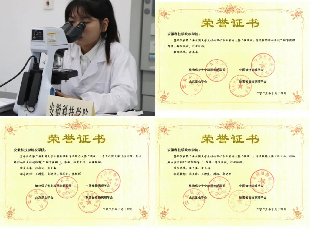 张享享老师获得青年教师学术论坛模块二等奖,周文鑫和黄玉娟(指导老师:毕亚玲、王增霞)获“专业技能大赛”模块“植物病虫害识别”项目二等奖,张忠玥和周文鑫(指导老师:王增霞、武德功、杜军利、张轶辉)获“昆虫解剖与结构绘图”项目三等奖,学校获团体优秀奖和优秀组织奖。