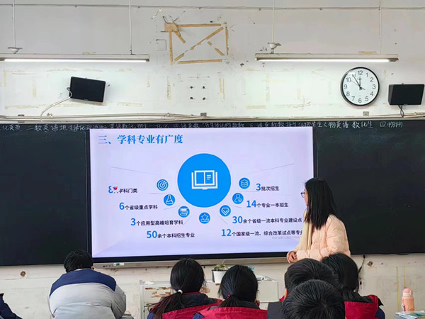 1月18日,邢雨洁带领团队一起回到母校涡阳县第一中学,借助PPT宣讲和互动交流等多种方式,向高中师生全方位介绍了新半岛官方网站_半岛(中国)的办学实力、校园环境、文化活动、优秀校友、发展成果等,传播安科声音,展现安科学子风采,扩大安科社会影响力,鼓励广大优秀学子报考安科。