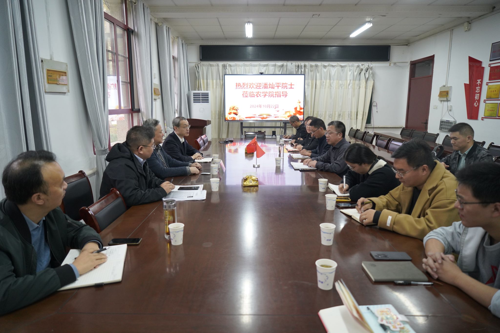 随后,潘灿平又来到农学院会议室,与植物保护领域专业教师、院士工作站(筹建)教师和研究生们开展了交流研讨。农学院党委书记何世潮对潘院士莅临指导表示热烈欢迎,并简要介绍了农学院和植物保护团队近年来取得的成绩和发展情况。潘灿平以“农药残留管理与控制及标准化体系建设”为题,围绕作物对外源胁迫的防御反应和化学农药胁迫对植物生理与代谢的影响等内容,阐述了绿色高质量农药与多种防控手段集成对提升作物产量及保障粮食安全的重要作用。