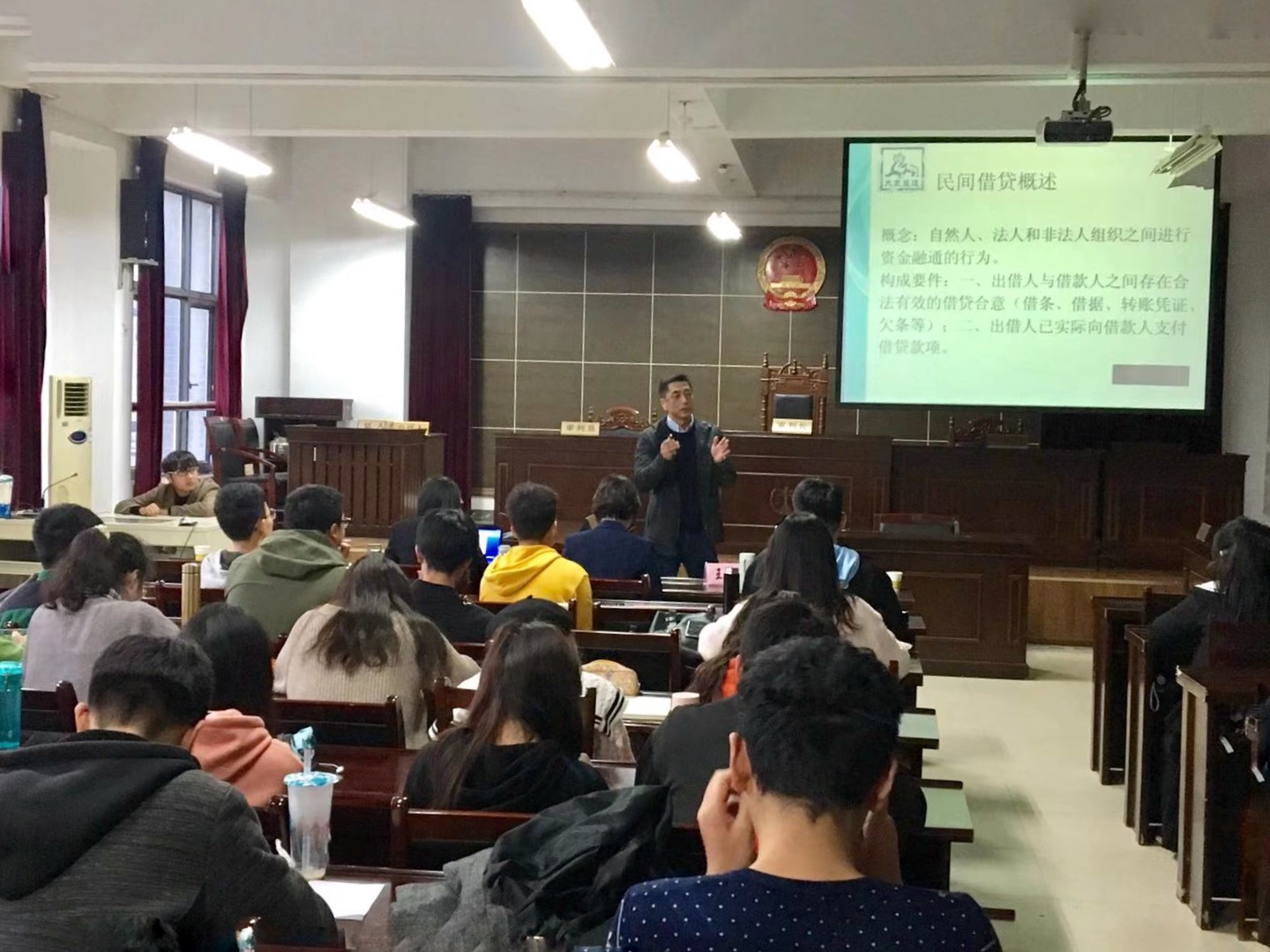 11月17日下午,“知秋杯”第一届新半岛官方网站_半岛(中国)法治论坛系列活动——“以案说法”在模拟法庭举办。安徽大友昱达律师事务所执行主任杨根宝作“民间借贷纠纷实例分析”主题报告。安徽大友昱达律师事务所律师王苏敏、安娟、黄娜、潘亮等受邀出席。活动由人文学院院长助理骆绪刚主持。