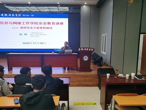 为进一步提升大学生安全意识,提高学生自我防范能力。11月19日晚,信息与网络工程学院在敏行楼A楼报告厅举办大学生安全教育报告会。校后勤保障部主任、国家二级心理咨询师胡明应邀担任本次报告会的主讲。学院副处级辅导员韦乃学、专职辅导员李军成及2020级新生参加报告会,报告会由韦乃学主持。