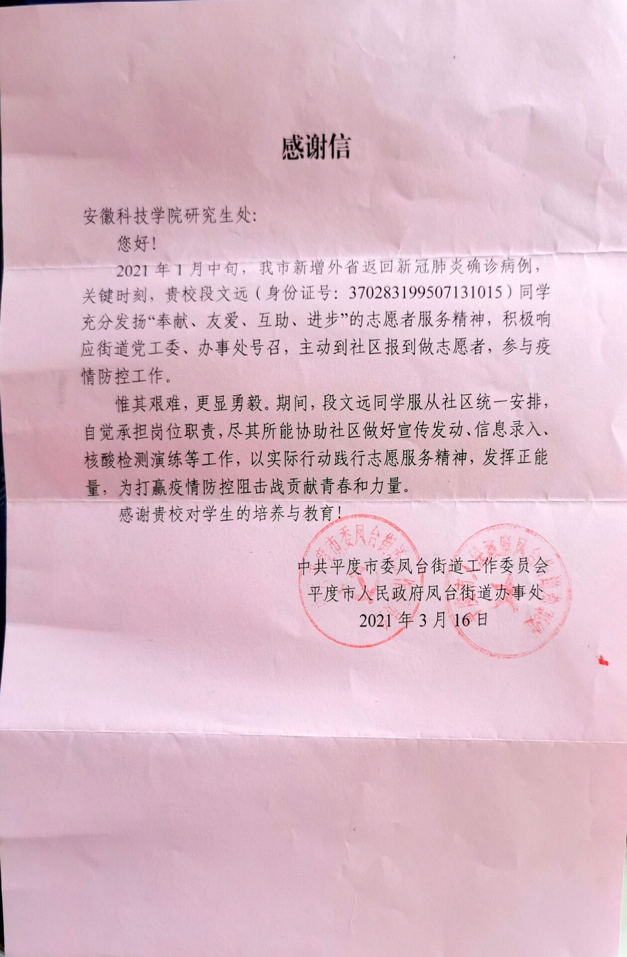 表扬信中指出,2021年1月中旬,平度市新增外省返回新冠肺炎确诊病例,关键时刻,段文远同学能主动请缨,尽其所能协助社区做好宣传发动、信息录入、核酸检测演练等工作,以实际行动践行志愿服务精神,发挥正能量,为打赢疫情防控阻击战贡献青春和力量。